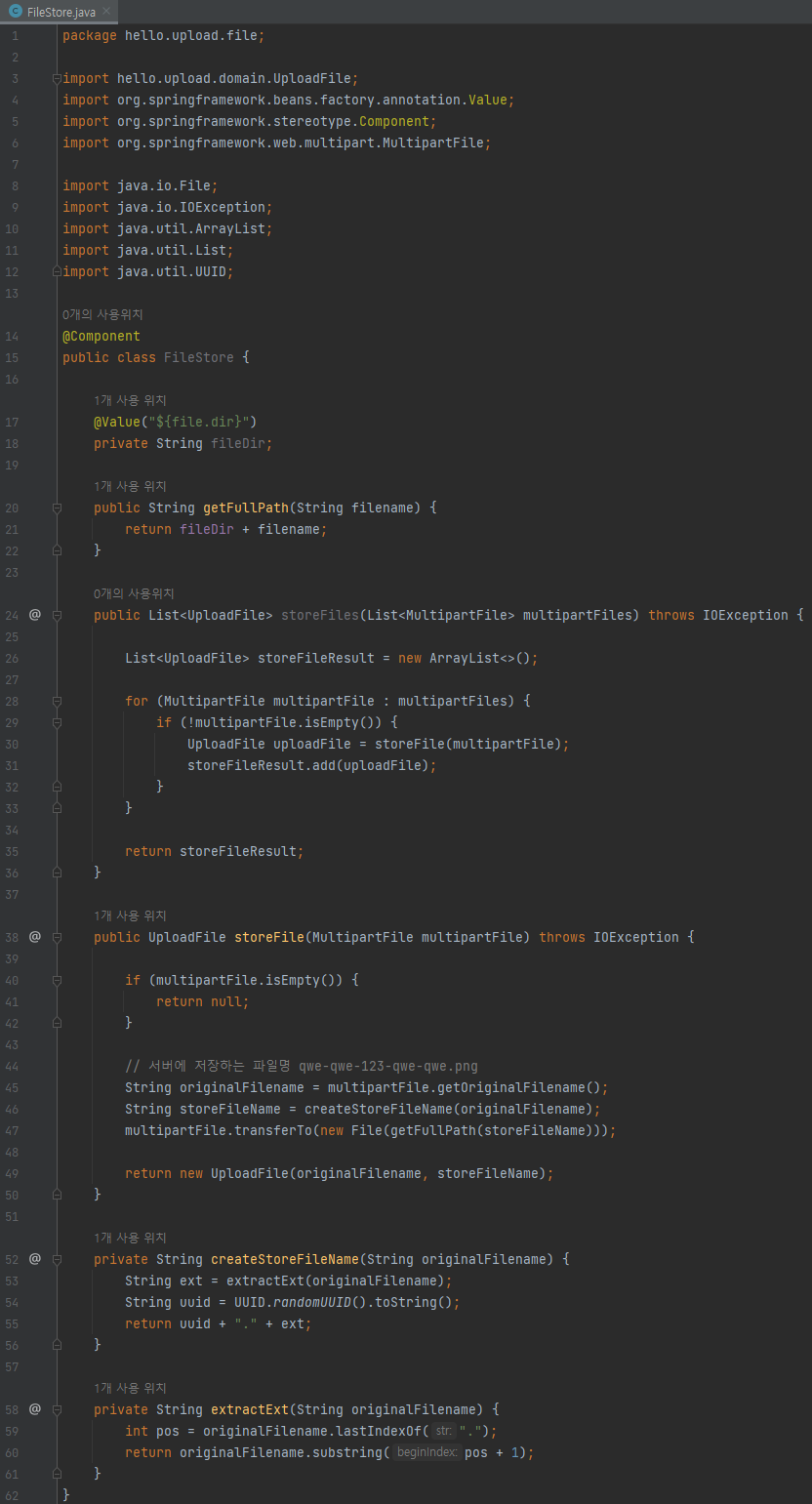 - createStoreFileName() : 서버 내부에서 관리하는 파일명은 유일한 이름을 생성하는 UUID를 사용해서 충돌하지 않도록 한다.