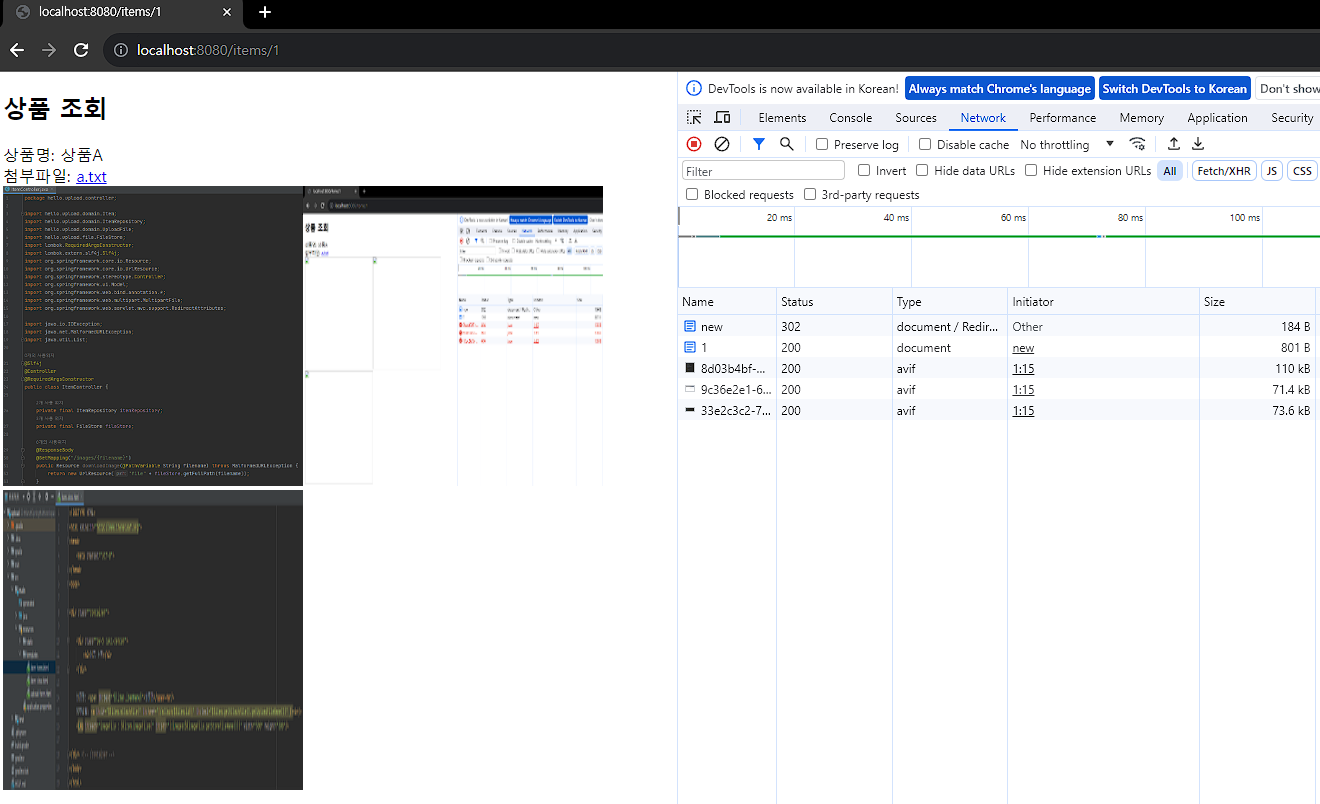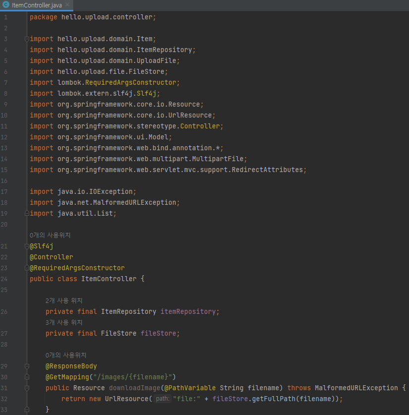 - @GetMapping("/images/{filename}") : <img> 태그로 이미지를 조회할 때 사용한다. UrlResource로 이미지 파일을 읽어서 @ResponseBody로 이미지 바이너리를 반환한다.