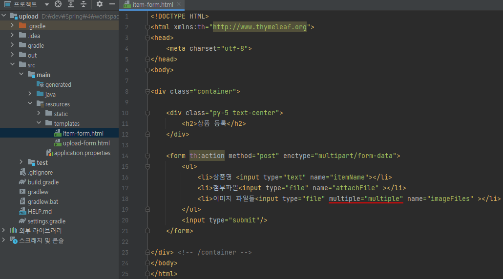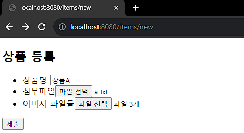 <!DOCTYPE HTML> <html xmlns:th="http://www.thymeleaf.org"> <head> <meta charset="utf-8"> </head> <body> <div class="container"> <div class="py-5 text-center"> <h2>상품 등록</h2> </div> <form th:action method="post" enctype="multipart/form-data"> <ul> <li>상품명 <input type="text" name="itemName"></li> <li>첨부파일<input type="file" name="attachFile" ></li> <li>이미지 파일들<input type="file" multiple="multiple" name="imageFiles" ></li> </ul> <input type="submit"/> </form> </div> <!-- /container --> </body> </html>
