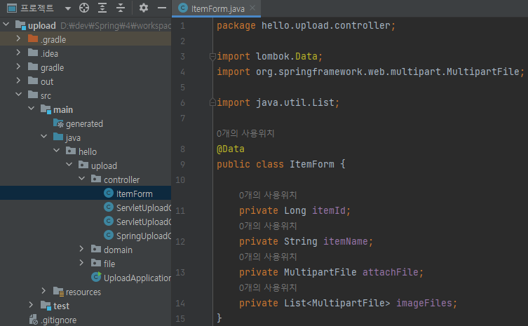 package hello.upload.domain; import lombok.Data; import java.util.List; @Data public class Item { private Long id; private String itemName; private UploadFile attachFile; private List<UploadFile> imageFiles; }