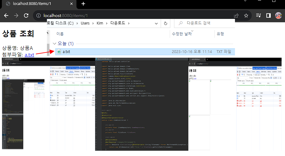 - @GetMapping("/attach/{itemId}") : 파일을 다운로드할 때 실행한다. 예제를 더 단순화할 수 있지만, 파일 다운로드 시 권한 체크 같은 복잡한 상황까지 가정한다 생각하고 이미지 id를 요청하도록 했다. 파일 다운로드 시에는 고객이 업로드한 파일 이름으로 다운로드하는 것이 좋다. 이때는 Content-Disposition해더에 attachment; filename="업로드 파일명" 값을 주면 된다.