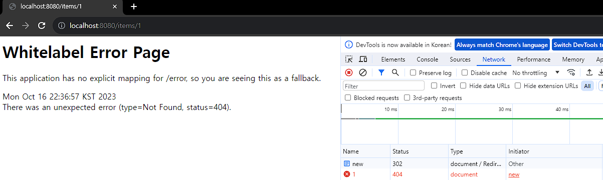 에러는 발생했지만 Status302로 정상 동작