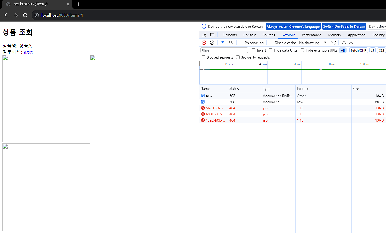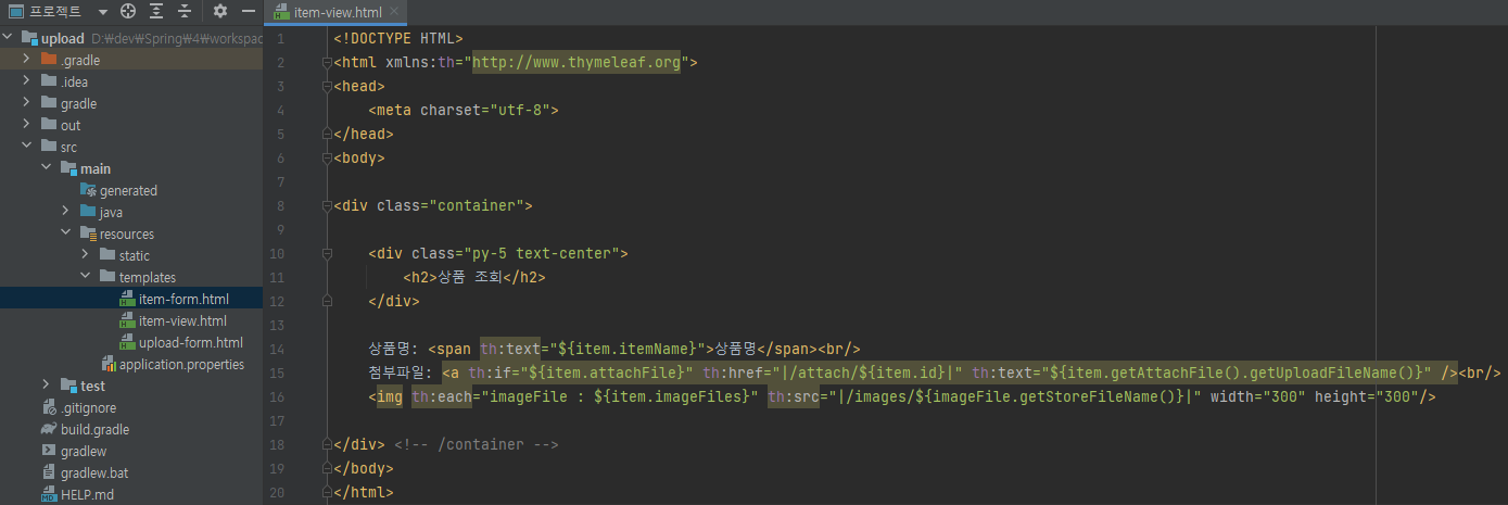 <!DOCTYPE HTML> <html xmlns:th="http://www.thymeleaf.org"> <head> <meta charset="utf-8"> </head> <body> <div class="container"> <div class="py-5 text-center"> <h2>상품 조회</h2> </div> 상품명: <span th:text="${item.itemName}">상품명</span><br/> 첨부파일: <a th:if="${item.attachFile}" th:href="|/attach/${item.id}|" th:text="${item.getAttachFile().getUploadFileName()}" /><br/> <img th:each="imageFile : ${item.imageFiles}" th:src="|/images/${imageFile.getStoreFileName()}|" width="300" height="300"/> </div> <!-- /container --> </body> </html>