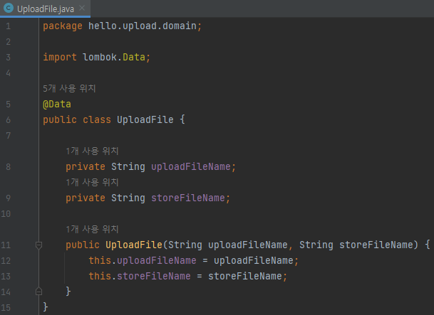 package hello.upload.domain; import lombok.Data; @Data public class UploadFile { private String uploadFileName; private String storeFileName; }