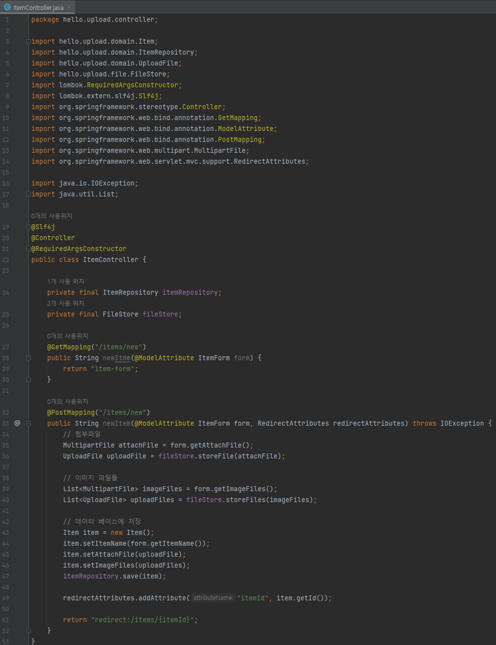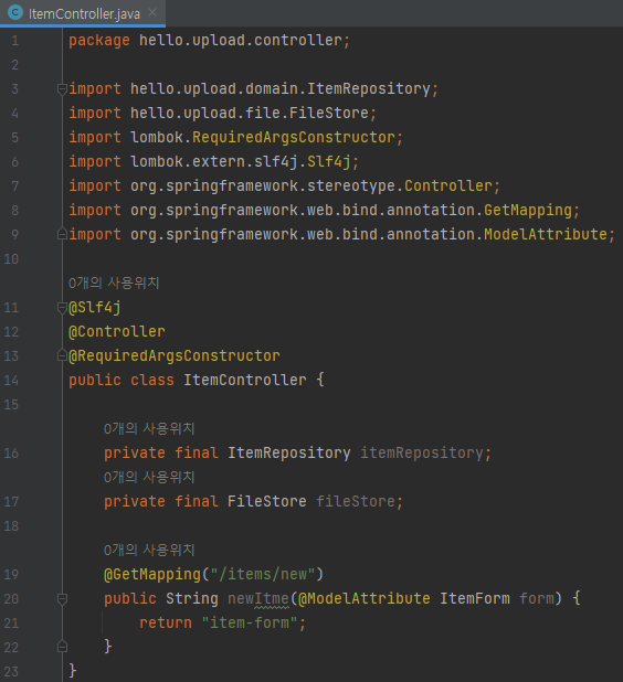 package hello.upload.controller; import hello.upload.domain.ItemRepository; import hello.upload.file.FileStore; import lombok.RequiredArgsConstructor; import lombok.extern.slf4j.Slf4j; import org.springframework.stereotype.Controller; import org.springframework.web.bind.annotation.GetMapping; import org.springframework.web.bind.annotation.ModelAttribute; @Slf4j @Controller @RequiredArgsConstructor public class ItemController { private final ItemRepository itemRepository; private final FileStore fileStore; @GetMapping("/items/new") public String newItme(@ModelAttribute ItemForm form) { return "item-form"; } }