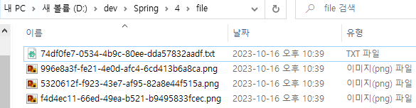 - extractExt() : 확장자를 별도로 추출해서 서버 내부에서 관리하는 파일명에도 붙여준다. 예를 들어서 고객이 a.png라는 이름으로 업로드하면 51041c62-86e4-4274-801d-614a7d994edb.png와 같이 저장한다.