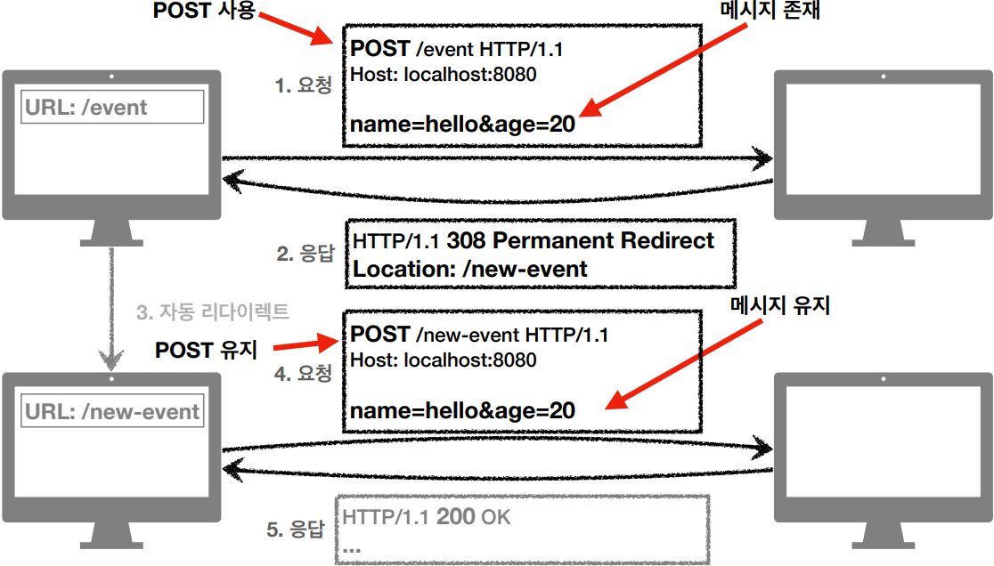 - 리다이렉트 시 요청 메서드와 본문 유지(처음 POST를 보내면 리다이렉트도 POST 유지)