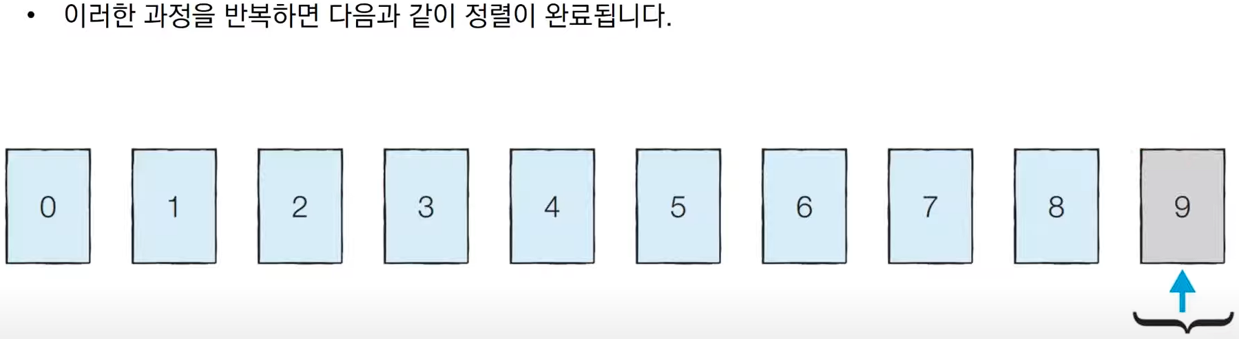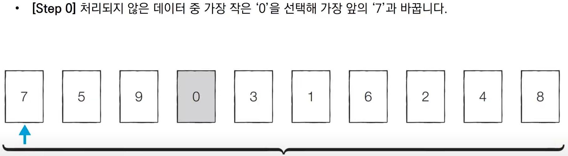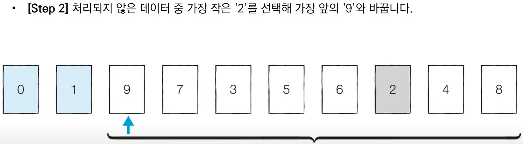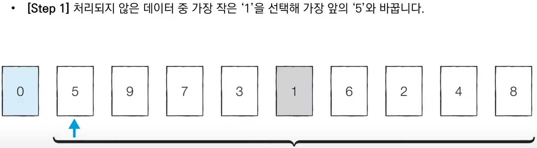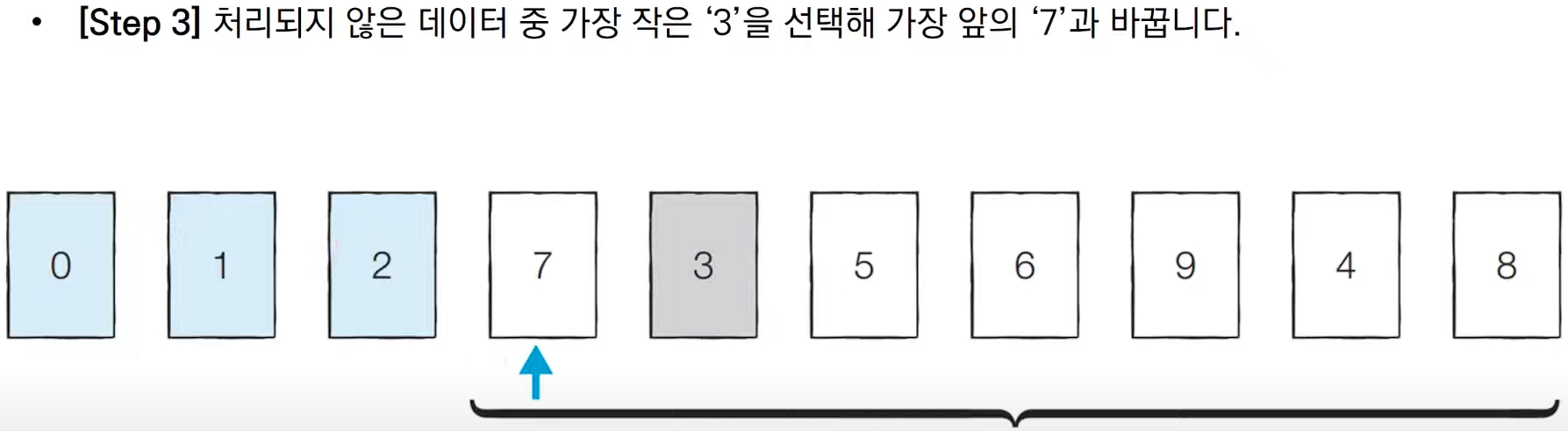 처리되지 않은 데이터 중에서 가장 작은 데이터를 선택해 맨 앞에 있는 데이터와 바꿈