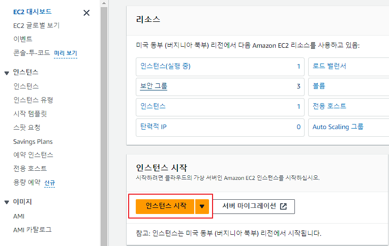 로그인 -> 인스턴스 시작 클릭