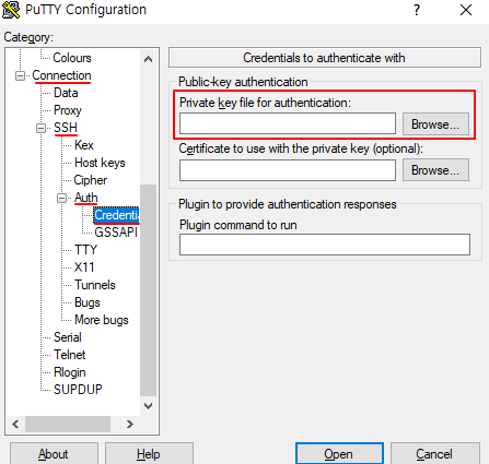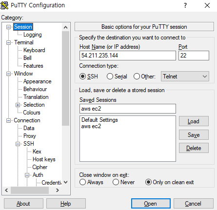 Private key file for authentication에 14번에서 만든 .ppk 파일 선택