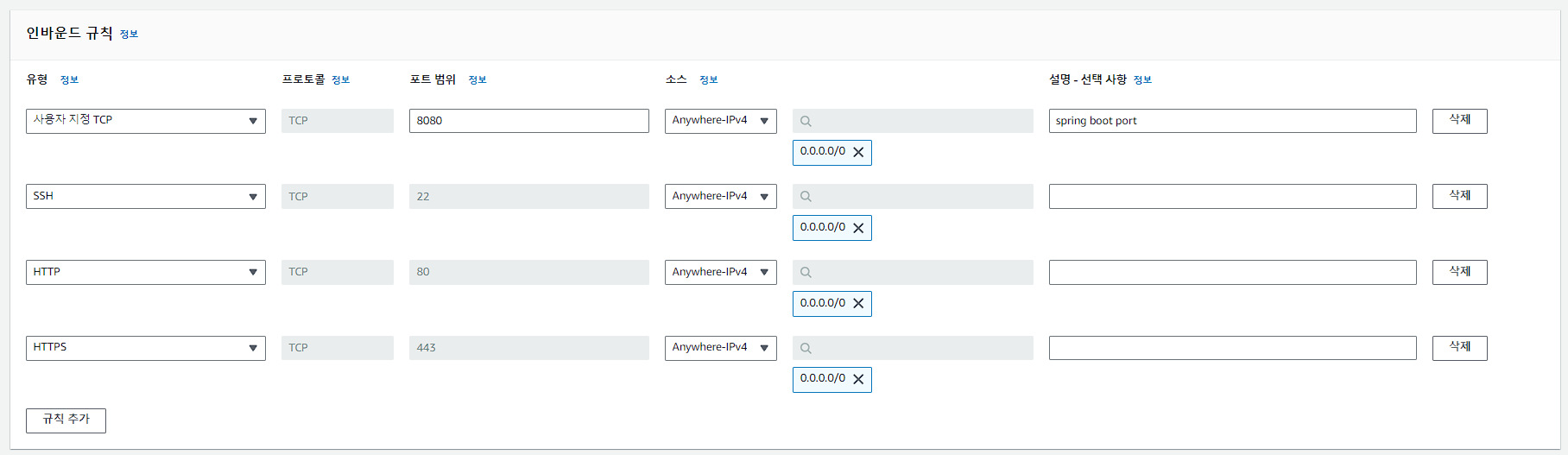 - 사용자 지정 TCP - TCP - 8080 - AnywhereIPv4 - spring boot port