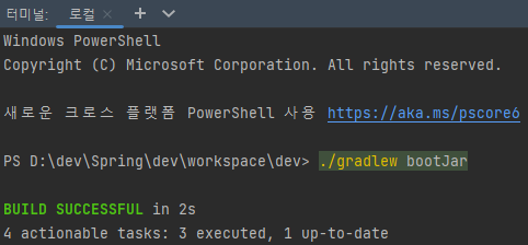 intellij의 터미널에 ./gradlew bootJar 입력하여 jar 생성