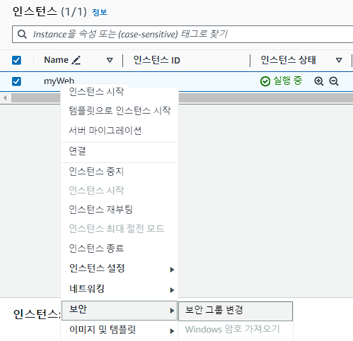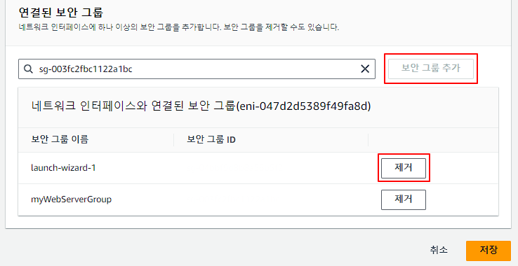 보안 그룹 추가로 10 ~ 11에서 만든 보안 그룹 추가 후 기존의 보안 그룹은 제거