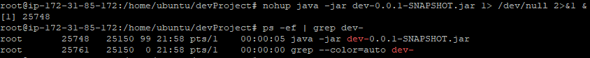nohup java -jar dev-0.0.1-SNAPSHOT.jar 1> /dev/null 2>&1 &