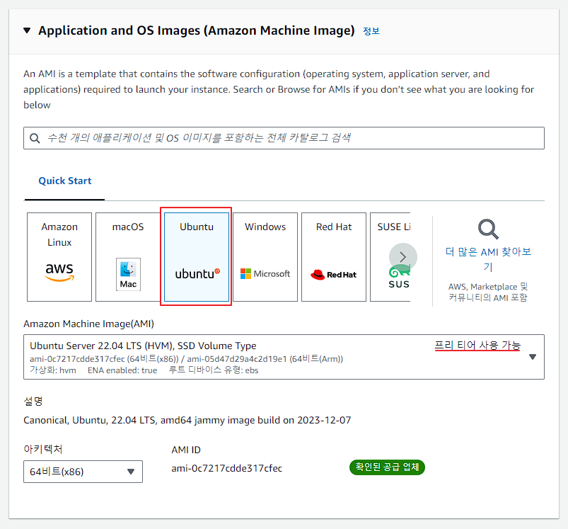 Ubuntu 선택 -> Amazon Machine Image(AMI)를 '프리 티어 사용 가능'으로 선택