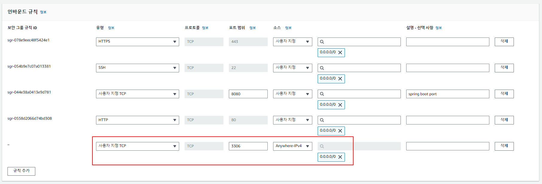 10번에서 설정한 인바운드 규칙에 mariadb 포트인 '3306' 추가