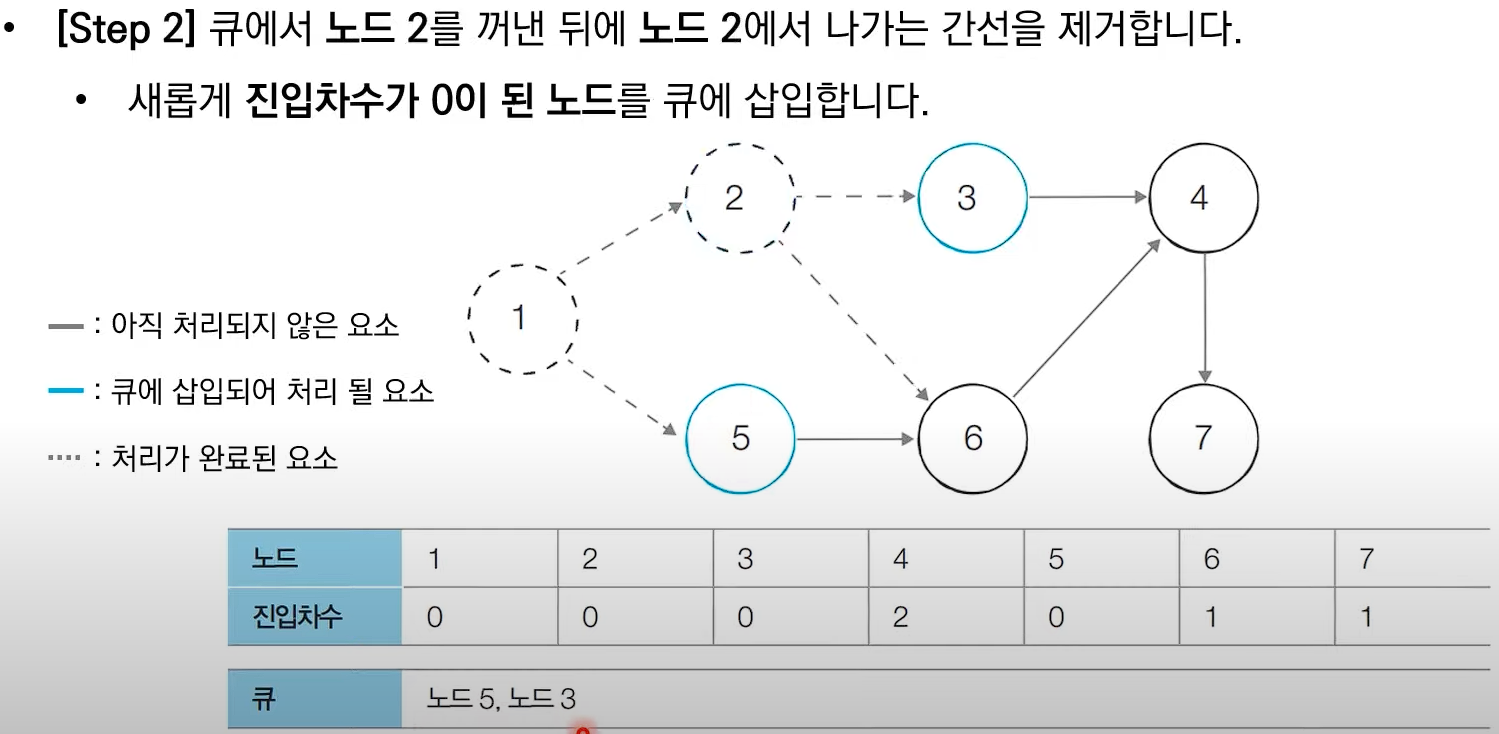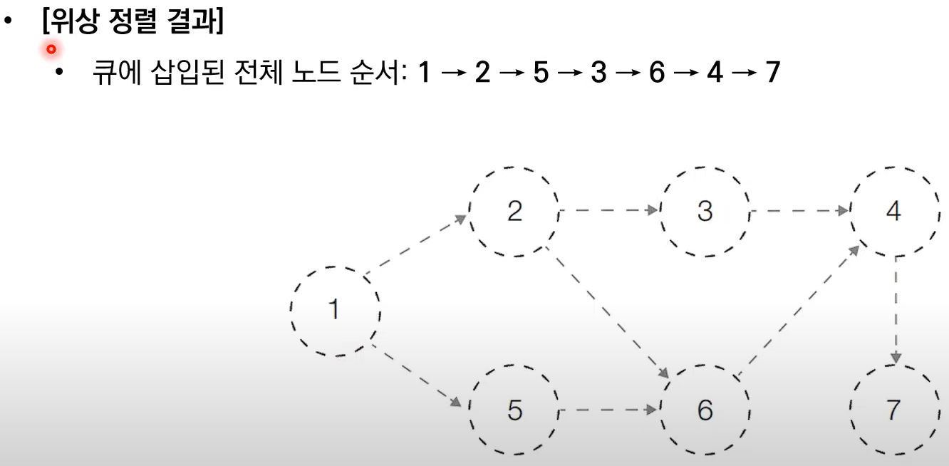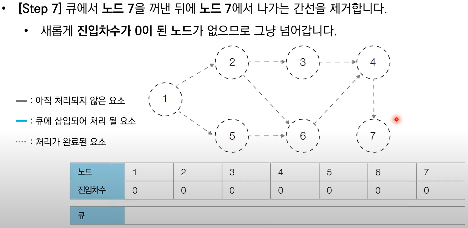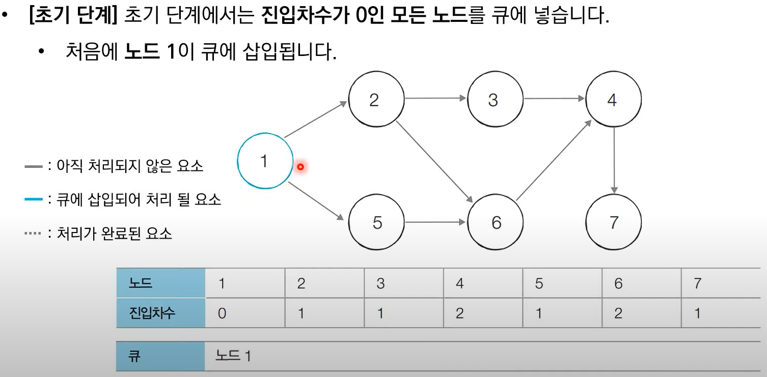 # 처음 시작할 때는 진입차수가 0인 노드를 큐에 삽입