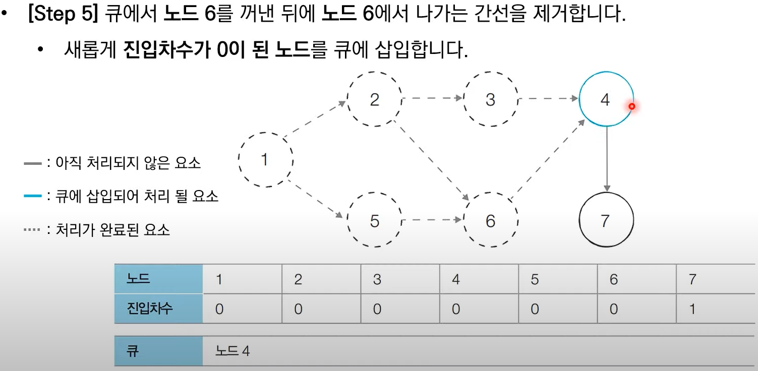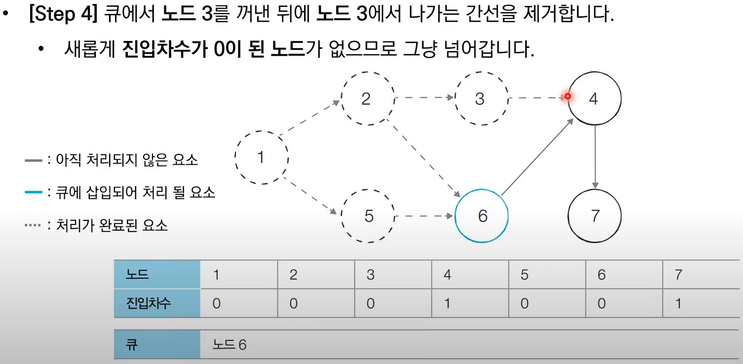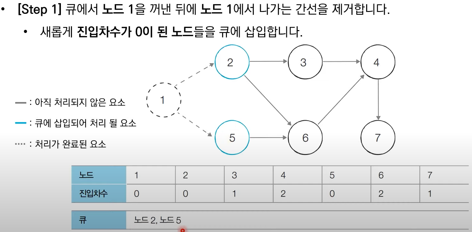 # 새롭게 진입차수가 0이 되는 노드를 큐에 삽입