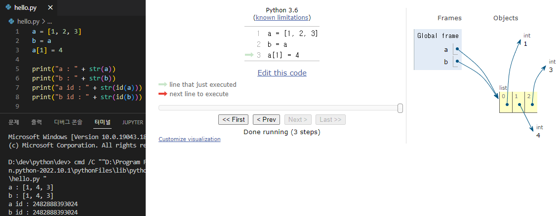 4. 변수 a와 변수 b의 값이 같다.(a = [1, 4, 3], b = [1, 2, 3]이 아님)